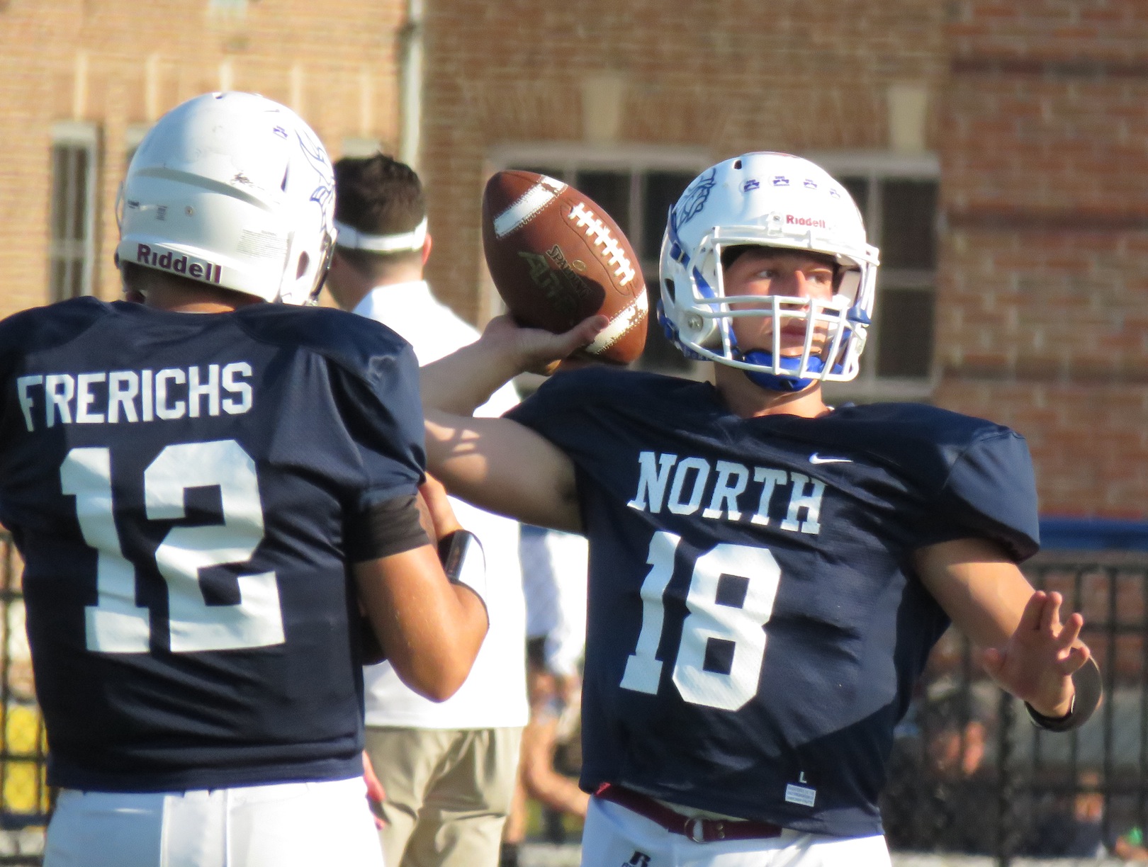 From left, quarterbacks Steve Frerichs of Wilson and Cam Sionko of Grand Island throw during warmups.