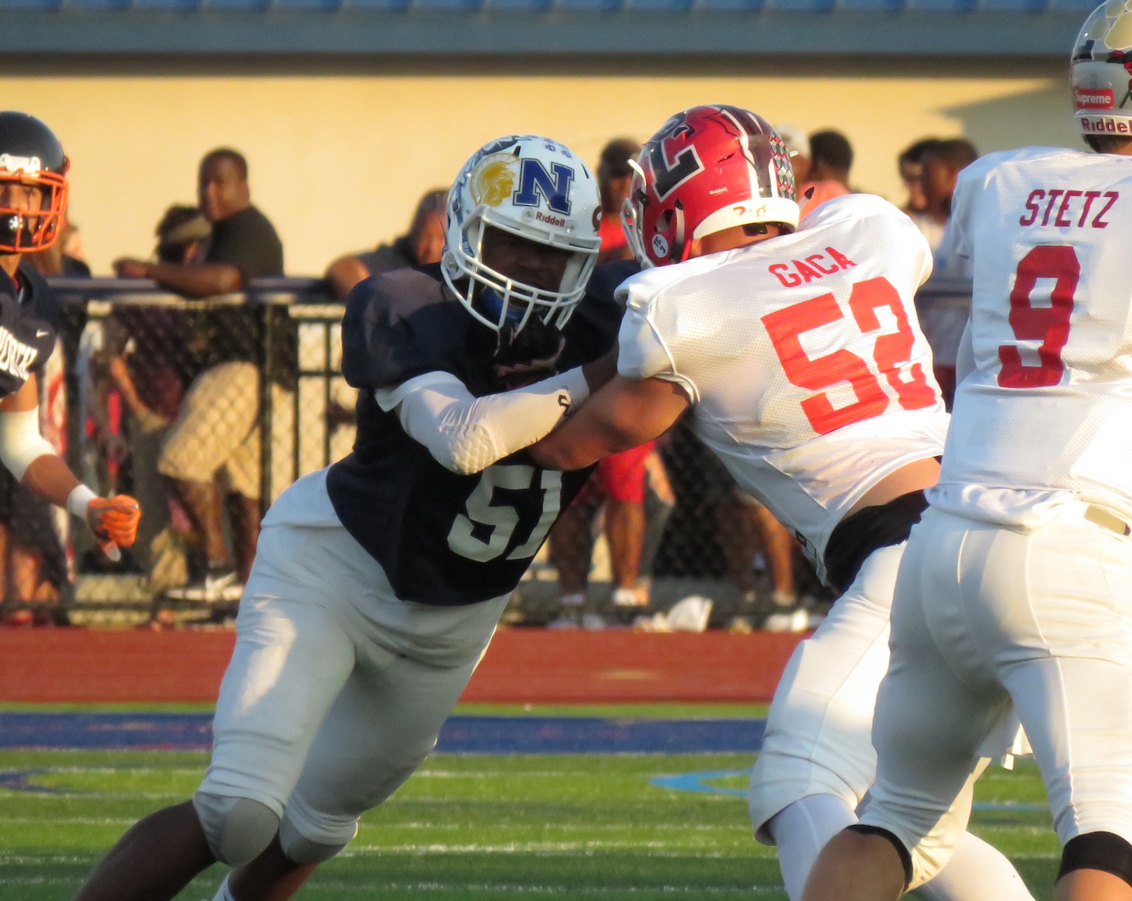 Jeremiah Wilkes IV, in blue, looks to get pressure on the quarterback.