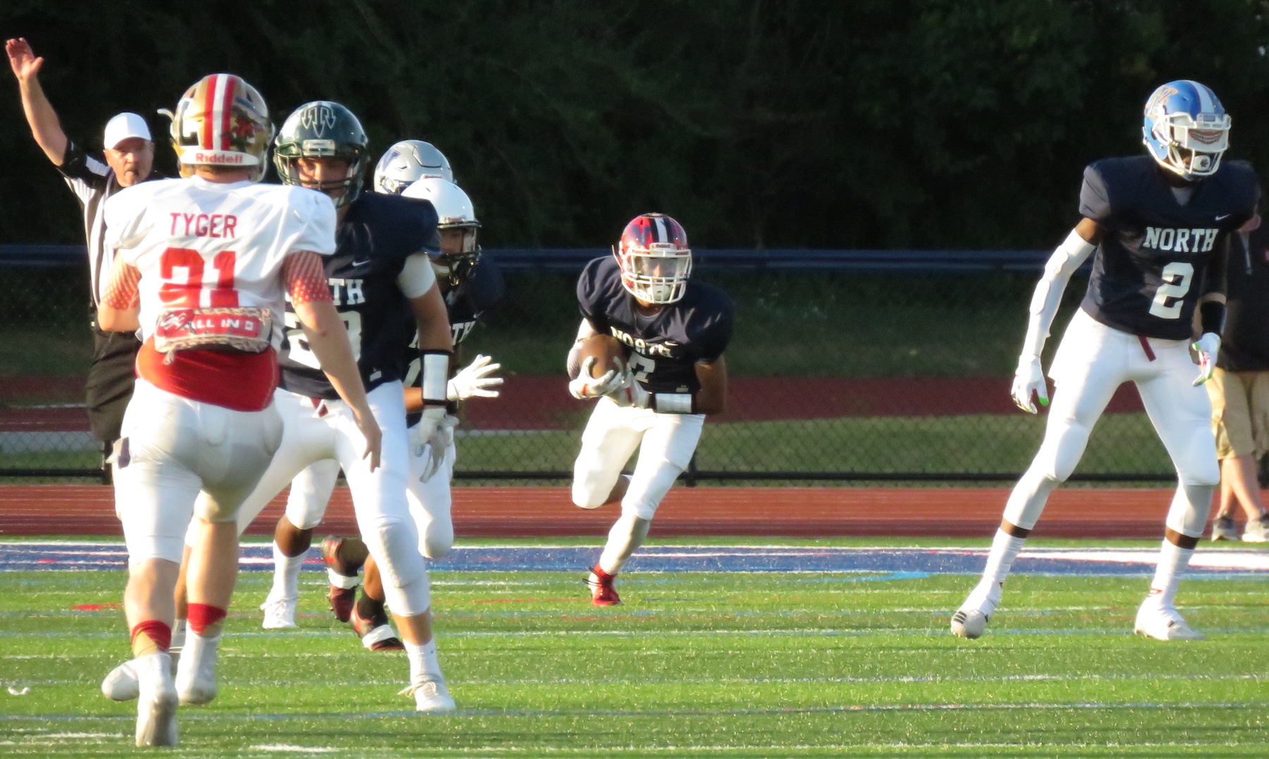 Sionko was behind center for periods during all four quarters. The Vikings QB executed a perfect two-minute drill before the end of the first half. On the drive, Sionko had a rush for 14 yards and passes for 35, 23 and 29 yards, the last being a touchdown to give the North its first score of the day.
