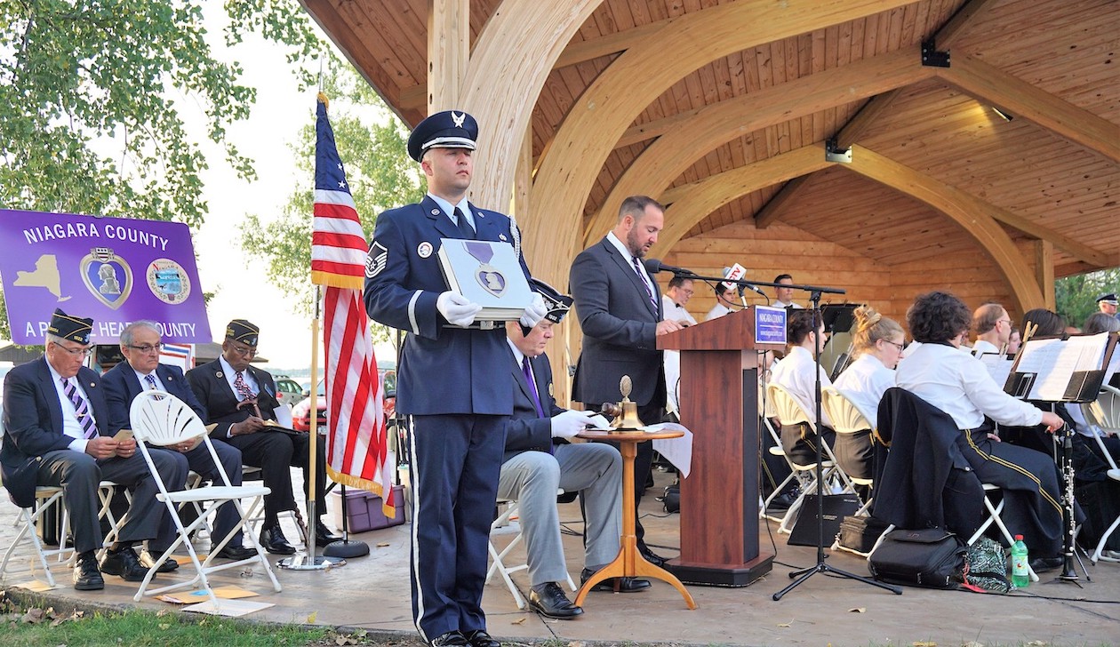 The names of roughly 300 Purple Heart recipients, both living and deceased, were read aloud during the ceremony. A bell tolled for each soldier who was killed in action. Living recipients who were able to attend Wednesday’s event were each presented with a commemorative pin and coin. In addition, a memorial “Book of Honor” that includes the names of all honorees was presented by the Niagara Falls Air Reserve Station Honor Guard. The book will be displayed in the Niagara County Courthouse rotunda.