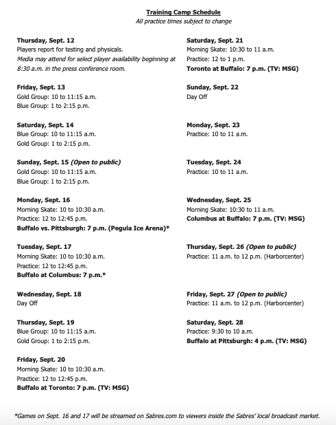 The Buffalo Sabres today announced the team will open its main training camp on Thursday, Sept. 12, when veteran players are scheduled to report for testing and physicals. Training camp will be held primarily at KeyBank Center, with sessions on Sunday, Sept. 15, Thursday, Sept. 26, and Friday, Sept. 27 open to the public.