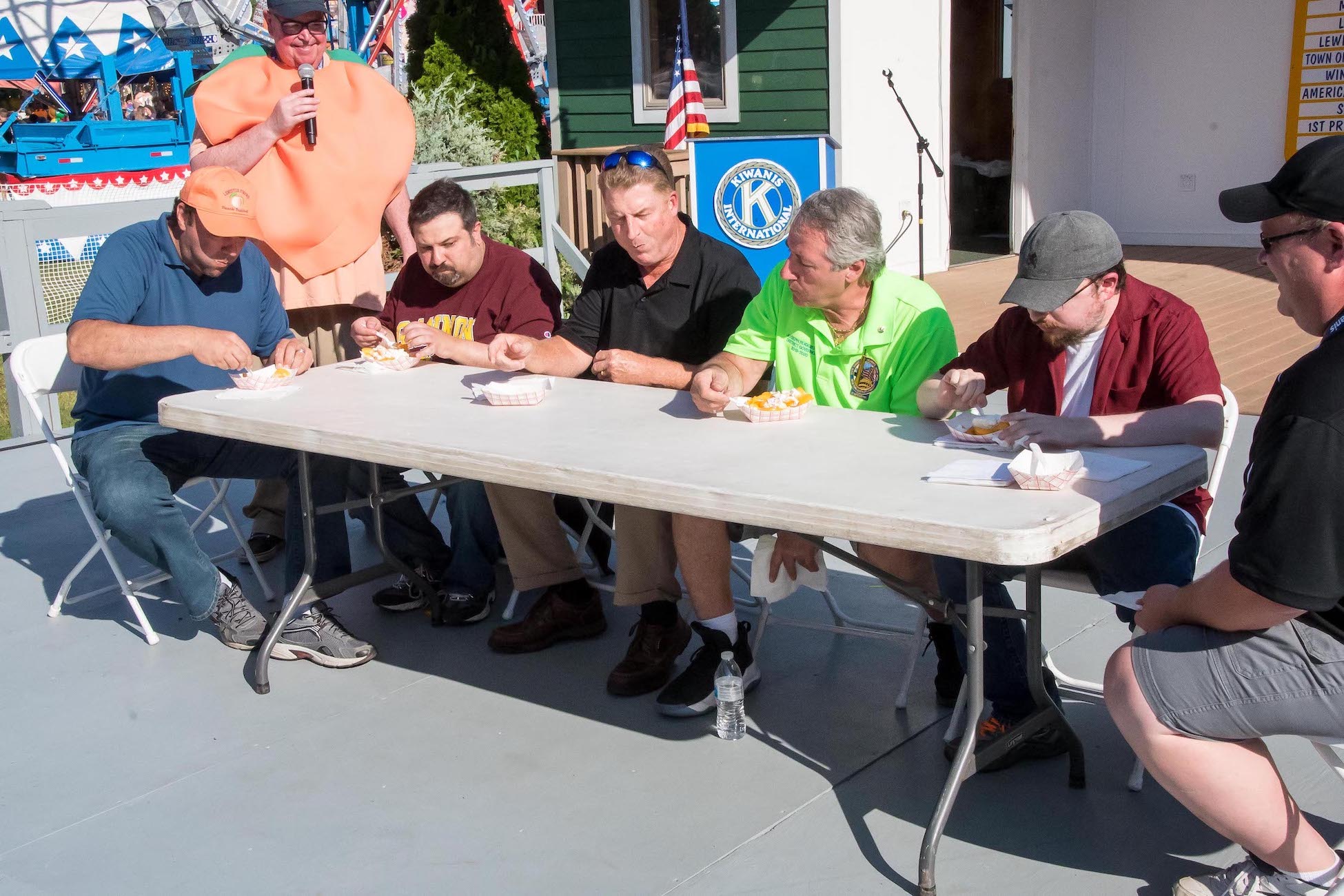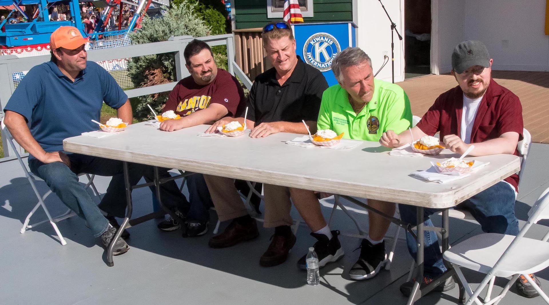 Shortly after 4:30 p.m., six competitors took to the bandshell stage, including Broderick, Beltrano, Kiwanis Club 2019-20 District Gov. Joseph Ruggiero, Kiwanian Tom Fontana, and local members of the media: Tom Puckett of WBEN-AM 930 and Joshua Maloni of Niagara Frontier Publications. Each contestant was given a DiCamillo Bakery shortcake covered with fresh peaches and topped with cream – the festival’s signature dish – and tasked with finishing the dessert in the fastest time.