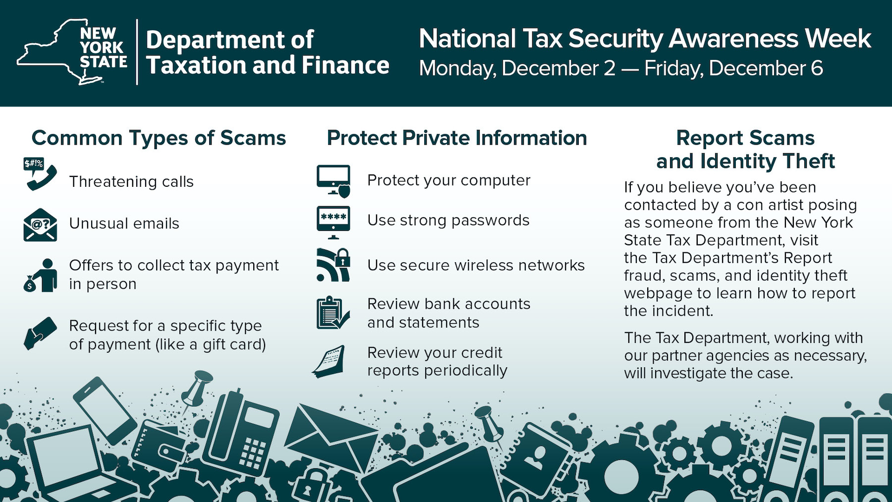 The New York State Department of Taxation and Finance shared a variety of tips and advice to help taxpayers protect themselves and their personal information online. The effort to safeguard sensitive data coincides with National Tax Security Awareness Week, which runs through Dec. 6.
