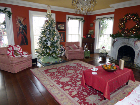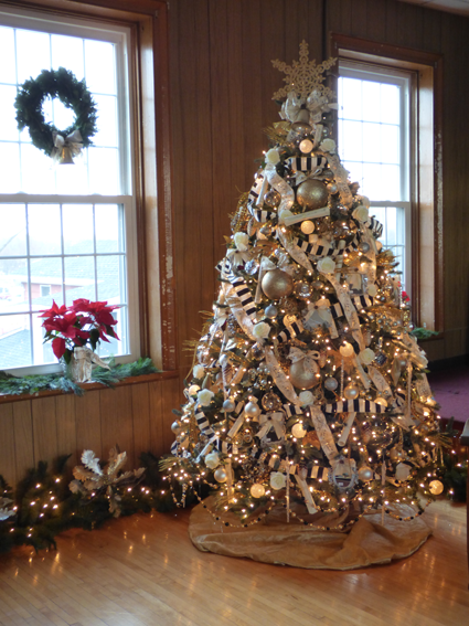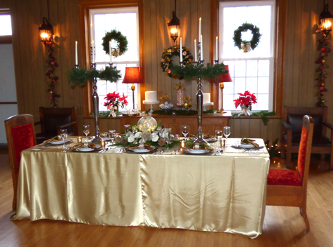 A festive Christmas tree and table at the Lewiston Opera Hall.