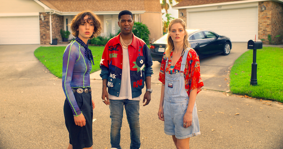 Brigette Lundy-Paine, Kid Cudi and Samara Weaving in “Bill & Ted Face the Music.” (Photo credit: Orion Pictures)