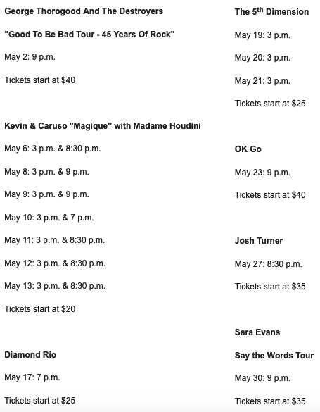 Fallsview Casino Resort's Avalon Theatre welcomes rock legend George Thorogood and The Destroyers, indie rock group OK Go, celebrated country group Diamond Rio and multi-Platinum artist Sara Evans in May.