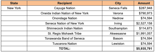 Native American tribes in New York will receive $5,935,791. The Tuscarora Nation outside of Lewiston will receive $74,594. For a complete breakdown of funding, see the chart below.