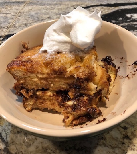 I poured the mixture over the first layer. Then I added chocolate chips. Then another layer of bread this time with some caramel syrup, topped with the rest of the egg/milk mixture. I sprinkled some sugar on the top and baked at 350 degrees for about 30-35 minutes. Used up some Cool Whip to top it off – although ice cream would be even better!