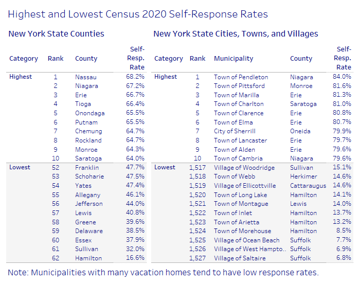 √ Towns and villages with the lowest response rates are all based in Suffolk County and include Village of Ocean Beach (7.5%), Village of West Hampton (6.9%) and Village of Saltaire (6.6%).