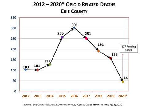 From a peak of 301 deaths in 2016, Erie County experienced three successive years of decreasing opioid-related overdose deaths, with 156 recorded in 2019. However, through July 23, 2020, the Erie County Medical Examiner’s Office has confirmed 44 opioid-related overdose deaths, with another suspected 127 cases pending confirmation.