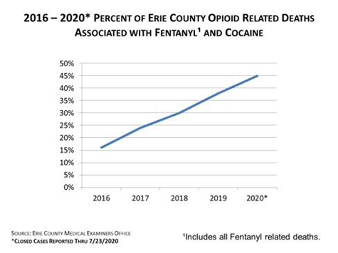 Through toxicology testing, the Erie County Medical Examiner’s Office has found an increasing percentage of these deaths are associated with fentanyl and cocaine, from just over 15% in 2016 to 45% of closed cases for 2020.
