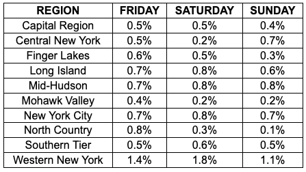 Of the 62,031 test results reported to New York state Sunday, 408 (0.66%) were positive. Each region's percentage of positive test results reported over the past three days is as follows: