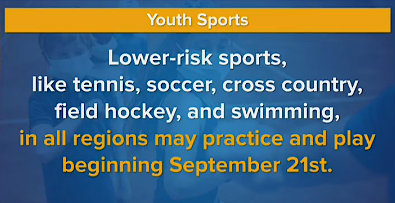 “September: schools are back, and working through that issue. The question of youth sports has come up,” he said. “The state has done a lot of research on youth sports and the guidance we've come up with is this: What's called 'lower-risk' sports: tennis, soccer, cross-country, field hockey, swimming, can start in all regions of the state – can practice and play – starting Sept. 21. So, schools will be coming back, there will be a little bit of a period to gauge what's happening, and on Sept. 21 they can start to practice and play all across the state.