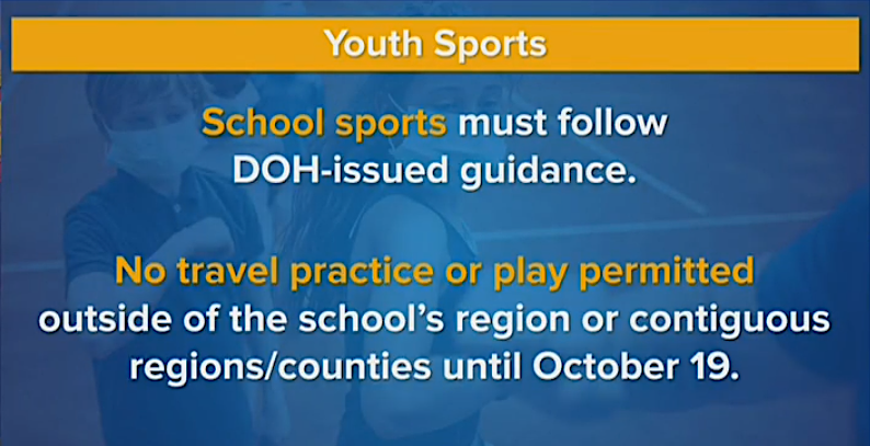 “There is guidance posted by the Department of Health on just how they should do it. But there will be no travel, practice or play permitted outside of the school's region. So, a school can play in the region. They can play with the contiguous region or county, but nothing outside of that until Oct. 19.