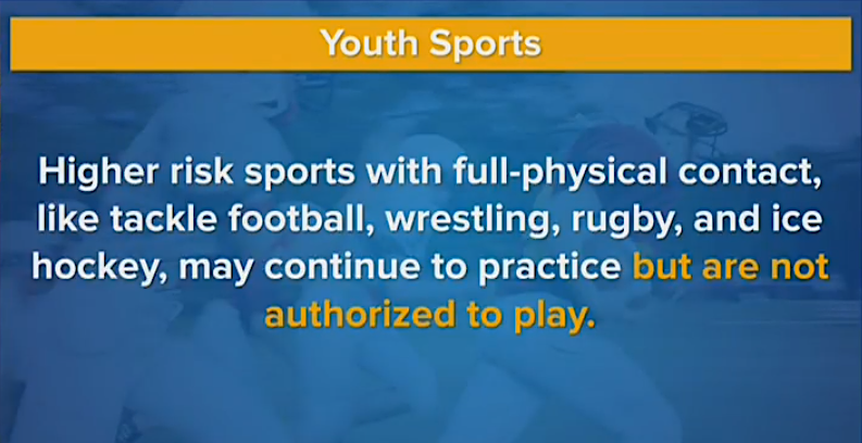 “The ‘higher-risk' sports, where there is full physical contact – like politics – tackle football, wrestling, rugby, ice hockey, may continue to practice, but they're not authorized to play at this point.”