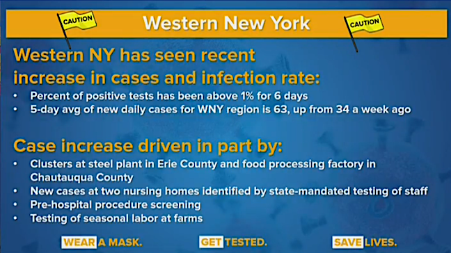 At the same time, he said, “Western New York, we have a caution flag and we're focusing on it and trying to understand exactly what is happening. The number of positive tests is somewhat escalated. Not a cause for serious concern, but it is a caution flag and we're looking at it.