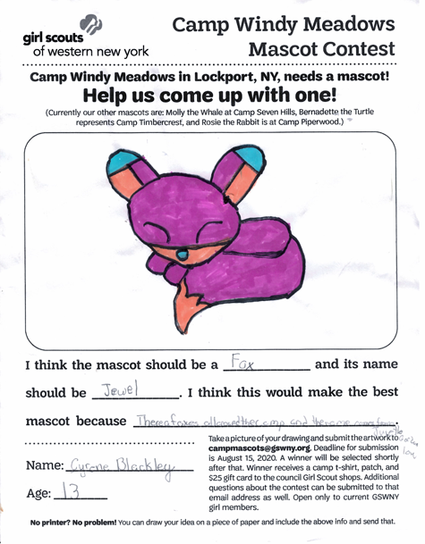 The contest was offered as part of the 2020 summer camp alternative programming. Girl Scouts all over Western New York were invited to design a camp mascot for Camp Windy Meadows located in Lockport. The camp operates as a day camp during the summer and is available for troops, programming, and rentals during the rest of the year. The camp did not have a mascot yet, unlike the other Girl Scouts of Western New York properties.