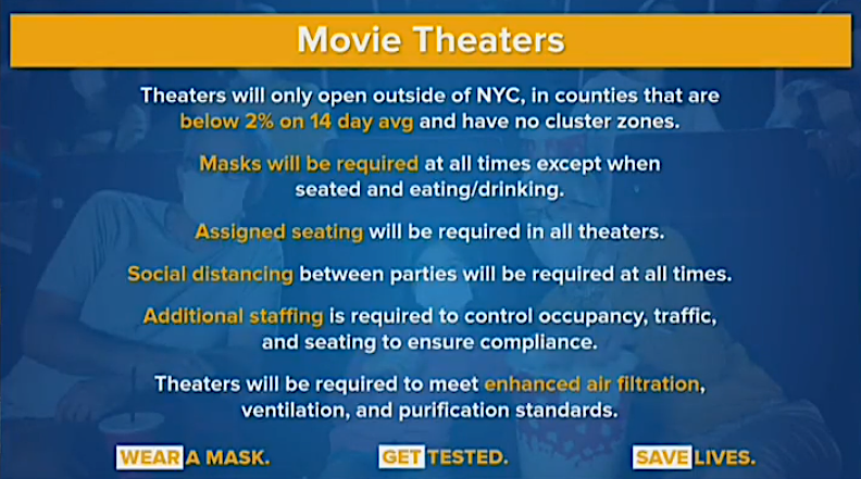 Theaters can only open outside of New York City in counties that have COVID-19 positivity rates of less than 2% on a 14-day average and do not have any cluster zones. Theaters will be subject to rigorous state guidance and enforcement.