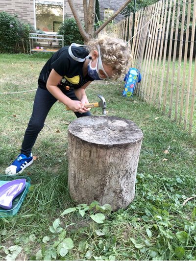 A few examples of outdoor learning since school returned include Montessori pre-K students performing their morning work in an outdoor classroom; Montessori students going on a nature hike in the woods, where found a fuzzy caterpillar, turkey feathers and falling leaves; kindergarten through eighth grade students learning outside; working in the children’s garden; and even enjoying lunch outside.