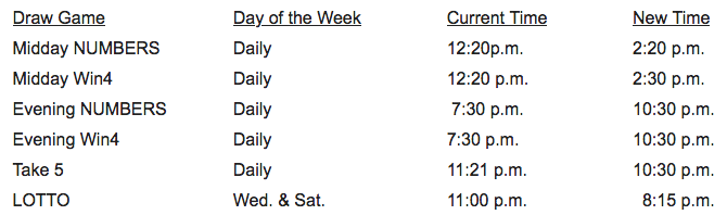 The new schedule provides more time for players to purchase tickets for the popular Midday and Evening NUMBERS and Win4 drawings. The new timetable will also mean the Take 5 and LOTTO drawings will air during prime time.