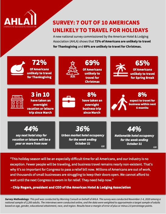 A new national survey commissioned by the American Hotel & Lodging Association (AHLA) shows many Americans are not expected to travel this holiday seasons. Results show 72% of Americans are unlikely to travel for Thanksgiving and 69% are unlikely to travel for Christmas, compounding the challenges for the hotel industry during this public health crisis.