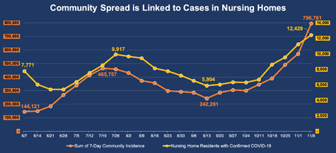 As experts have repeatedly noted, COVID-19 cases in a surrounding community is a top factor in outbreaks in nursing homes. University of Chicago's Tamara Konetzka, a nationally recognized expert on long-term care, recently said, “Trying to protect nursing home residents without controlling community spread is a losing battle.” Dr. David Grabowski, professor of Health Care Policy, Harvard Medical School, recently stated, “The strongest predictor of whether or not we’ll see cases in (a particular setting) is community spread.”
