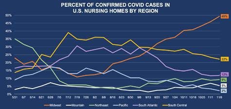 During the second week of November, nearly half (49%) of new COVID-19 cases in nursing homes were from Midwest states with major spikes in community spread in the upper parts of the region. As a result, the Midwest region saw a 275% increase in weekly COVID cases in nursing homes since mid-September.