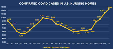 The American Health Care Association and National Center for Assisted Living (AHCA/NCAL), representing more than 14,000 nursing homes and assisted living communities across the country that provide care to approximately 5 million people each year, released a report showing nursing homes in the U.S. continue to see a record number of weekly new cases this month due to the community spread among the general population, surpassing previous peaks since the Centers for Medicare & Medicaid Services (CMS) started tracking cases in nursing homes.