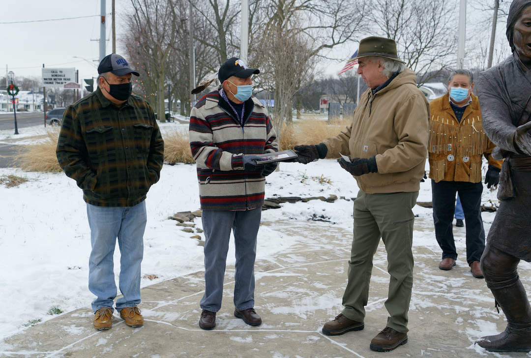 Paying tribute to two Tuscarorans who were involved in the bicentennial project, Historical Association of Lewiston volunteer Lee Simonson presented Tuscarora Council member Neil Patterson Sr. with a photo of his wife, Francene Patterson, who recently passed away. Francene, who was fluent in the Tuscarora language, is shown inspecting the final clay sculptures in 2013 before they were cast in bronze.