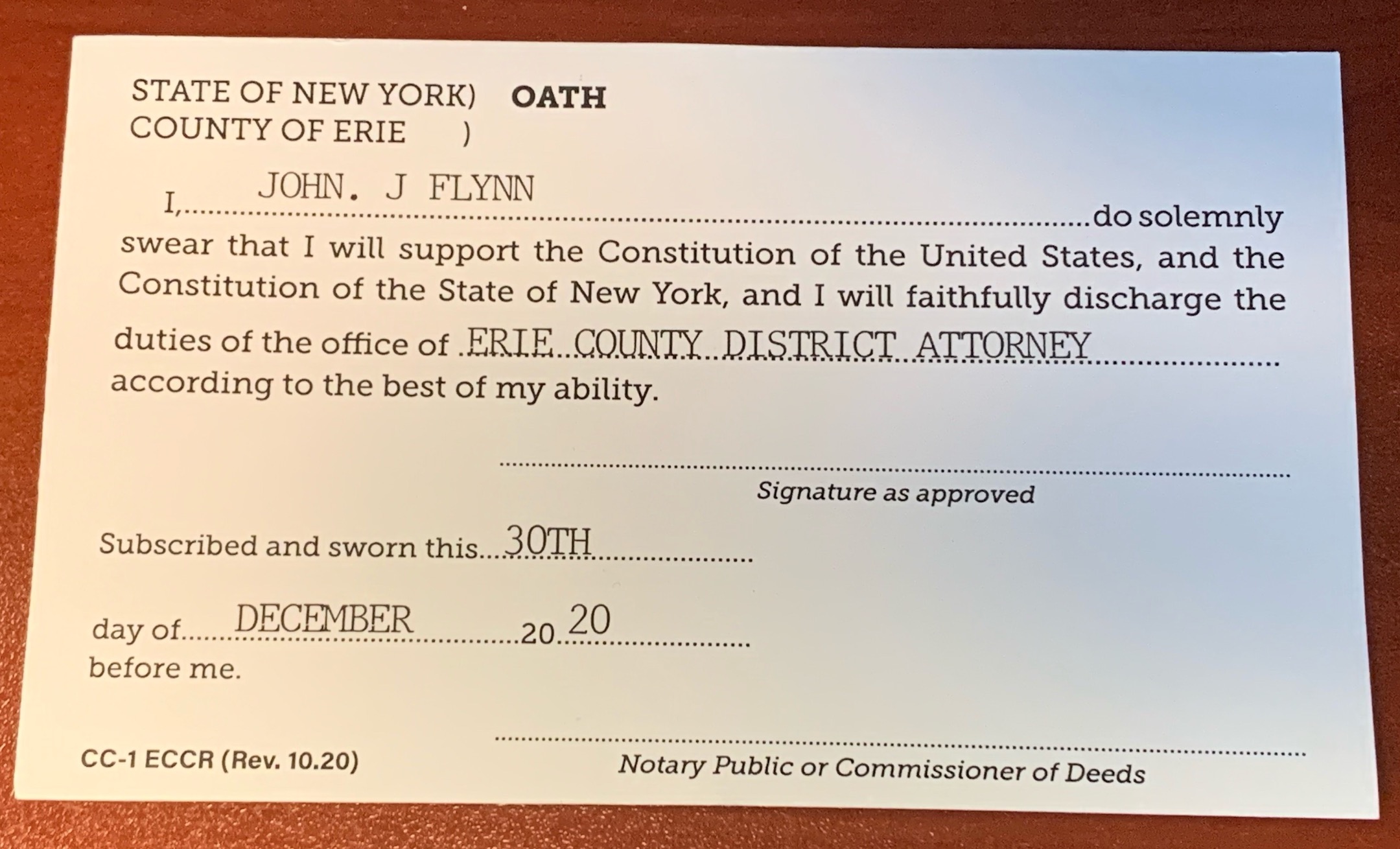 John J. Flynn was sworn in for a second term as Erie County district attorney at a small event held in his office on Wednesday afternoon. The inauguration ceremony was the signing of the Oath of Office card, notarized by Sylvia Collins, assistant confidential secretary, who officially swore in Flynn as the 41st district attorney for Erie County.
