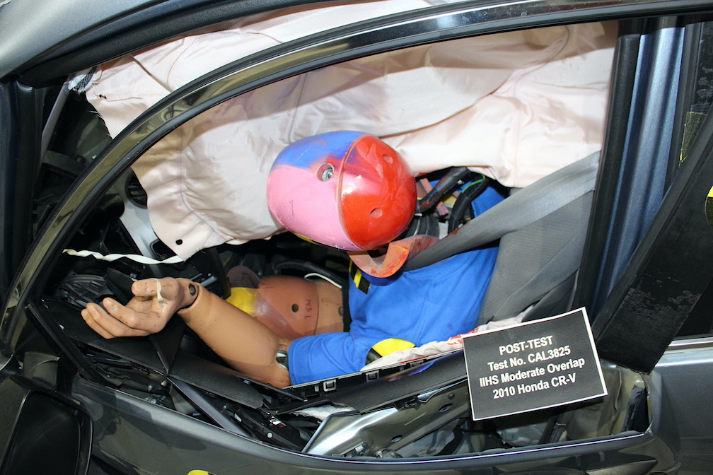 Three 2010 Honda CR-V EX crossovers were used because they represented the average age (11.8 years) of a typical vehicle on U.S. roadways and earned the top rating in the IIHS moderate overlap front test.