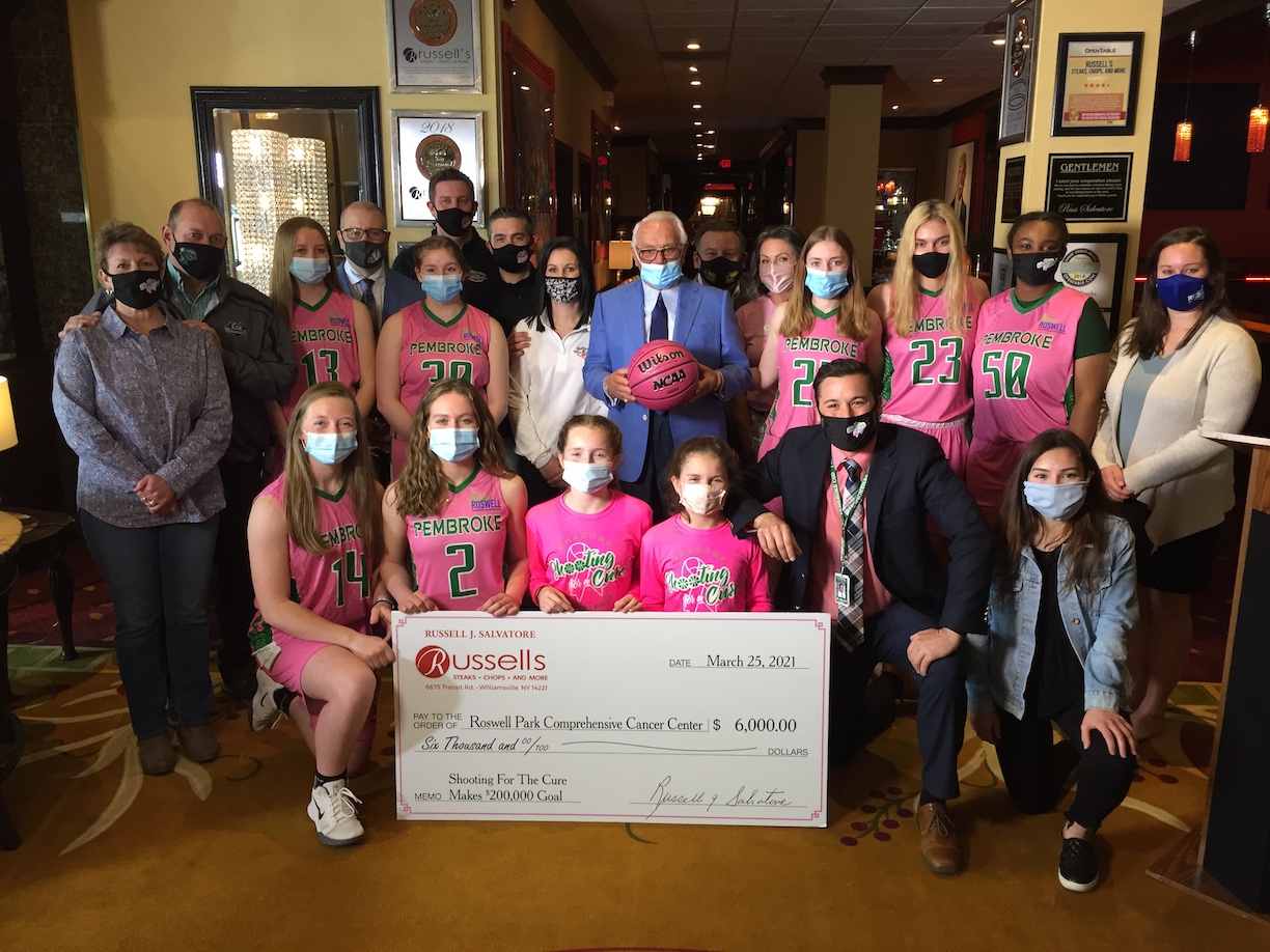 Hospitality icon Russell J. Salvatore made a surprise donation to the Pembroke High School Dragons varsity girls basketball team, coach Ronald Funke, and “Shoot For The Cure” event organizer and special education teacher Michael Wilson on Thursday. Salvatore presented a check for $6,000, bringing the “Shooting For A Cure!” to a 10-year goal of $200,000, supporting research at Roswell Park Comprehensive Cancer Center.