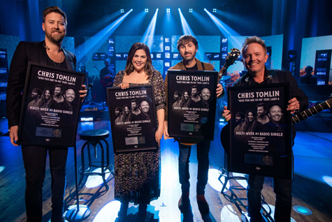 Chris Tomlin presents a No. 1 plaque to Lady in celebration of the band's Billboard Christian Airplay Chart six-week No. 1 single "Who You Are To Me" during the taping of "Good Friday Worldwide." Pictured are Charles Kelley, Hillary Scott and Dave Haywood of Lady A with Tomlin. (Photos by Makayla Symmonds/courtesy of Schmidt Relations)