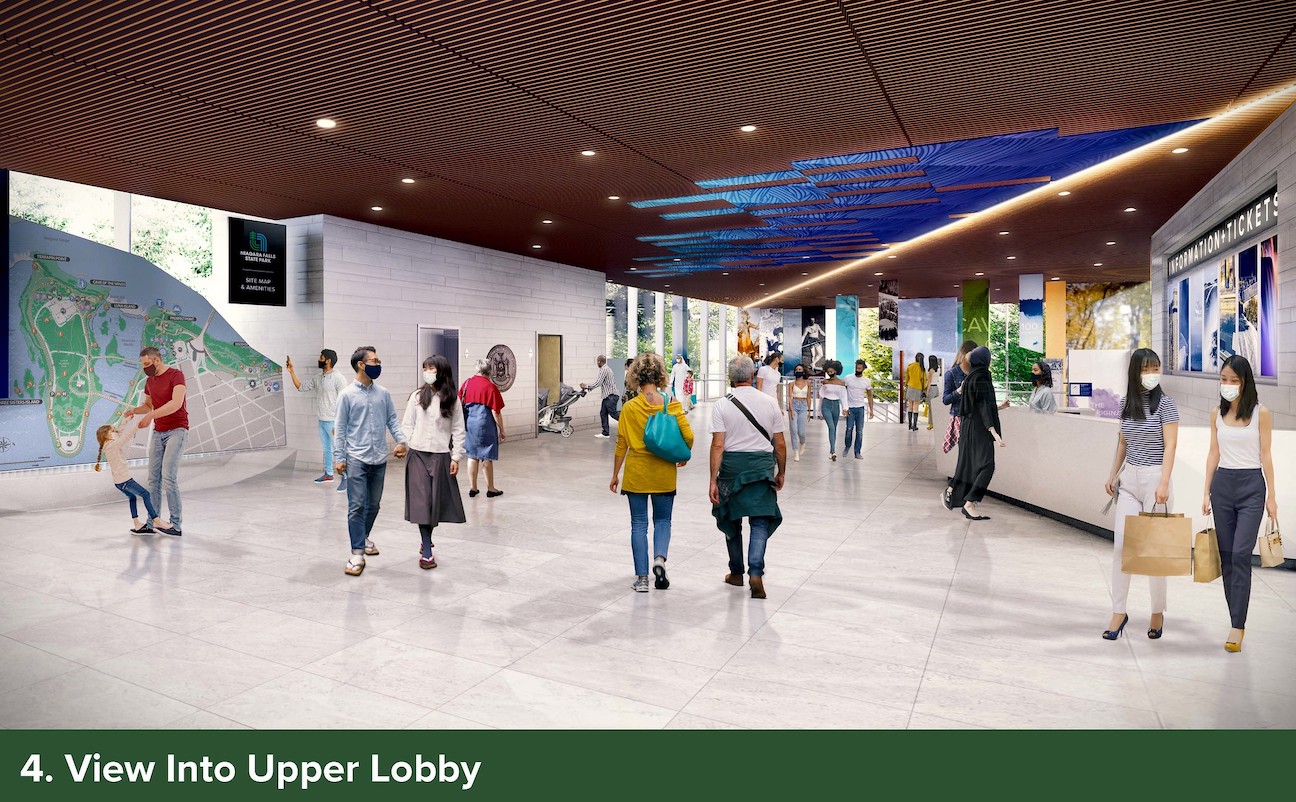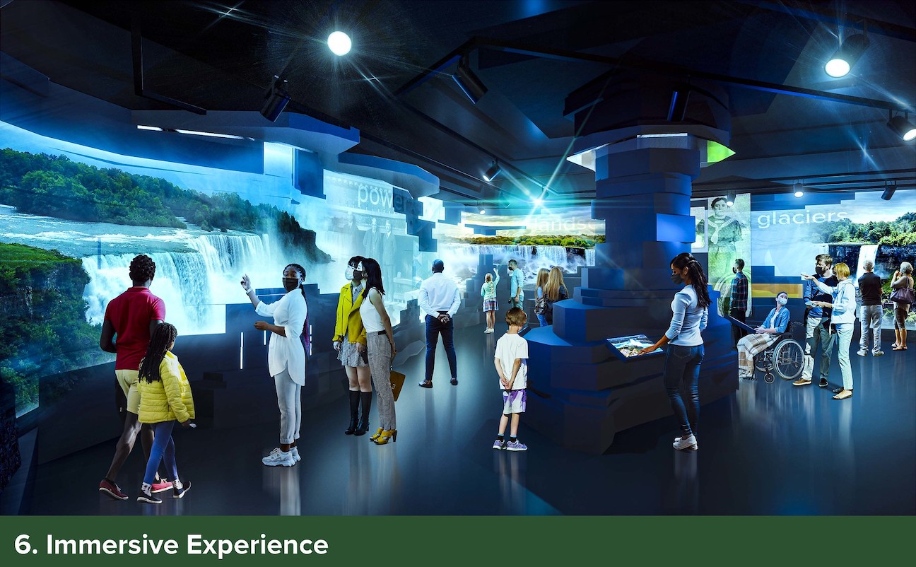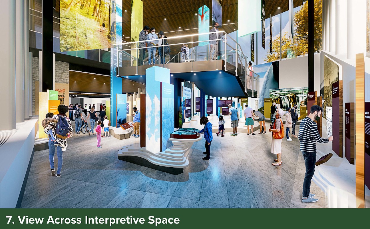 The proposed 28,000-square-foot visitor center will include new ticketing and information desks; interpretive museum space including an immersive experience and exhibits highlighting a diversity of topics including natural, industrial and Indigenous American history; new concession spaces; restrooms and associated support spaces. The glass, steel and concrete facility has been designed to complement nature and include a rooftop solar array, green roof elements and a separate restroom building. Enhanced site amenities include new accessible paths; plantings; outdoor exhibits, and interpretive and wayfinding elements.