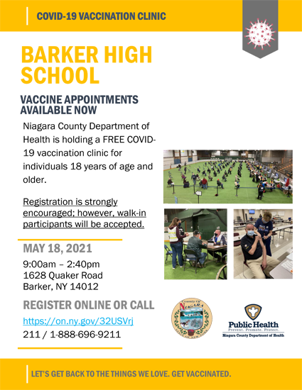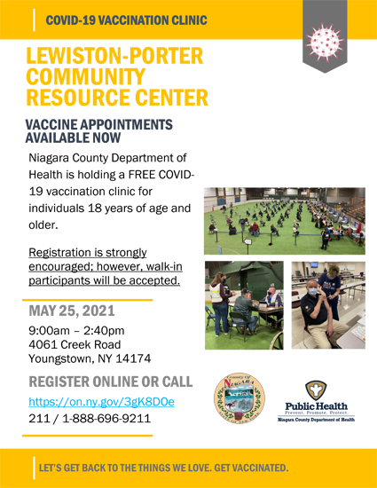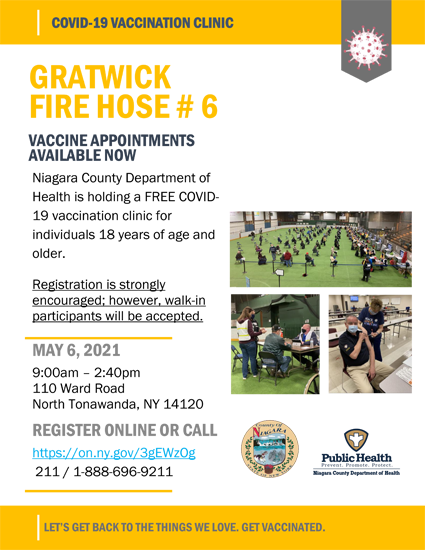 To secure an appointment, individuals 18 years of age and older may visit www.niagaracounty.com and click on the blue box that says “COVID-19 Vaccination Info.” Niagara County residents who do not have internet access may register for an appointment by calling 211 or 1-888-696-9211.