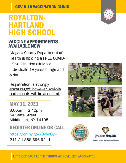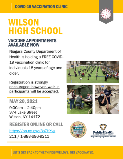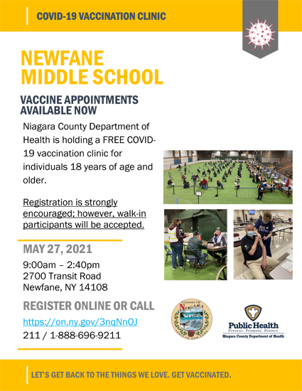 The Niagara County Department of Health will hold several free COVID-19 vaccination clinics across Niagara County throughout the month of May.