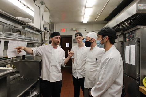 Head chef Peyton Fadel goes over plans for the evening’s dining menu and preparation at the Buffalo Launch Club with his staff, from left, Charlie Hegarty, Peter Bucki and Josh Volk.