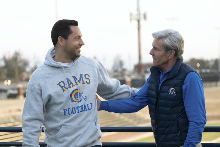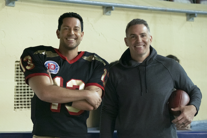 Zachary Levi and Kurt Warner on the “American Underdog” set. (Photo by Mike Kubeisy/courtesy of Lionsgate)