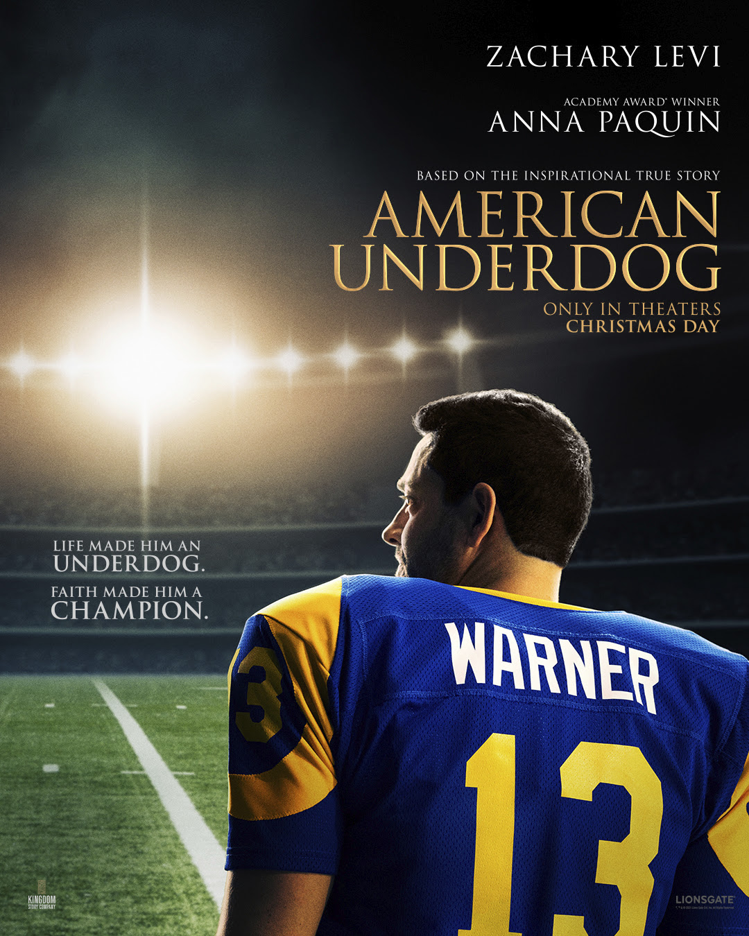 “American Underdog” will be released on Christmas. The film tells the inspirational true story of Kurt Warner (Zachary Levi), who went from a stockboy at a grocery store to a two-time NFL MVP, Super Bowl champion, and Hall of Fame quarterback.