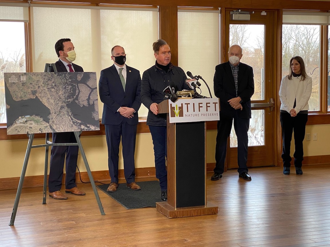 Congressman Brian Higgins recently joined Buffalo Museum of Science President and CEO Marisa Wigglesworth to suggest construction of a new, Americans with Disabilities Act-accessible trail at Tifft Nature Preserve be incorporated into ongoing Buffalo waterfront development plans. New York State Sen. Tim Kennedy, Assemblyman Jon Rivera, Buffalo City Councilmember Chris Scanlon and other community partners joined in support of the new trail, which they said would improve access to nature and environmental education experiences for families and people with disabilities.