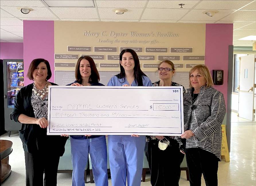 Niagara Falls Memorial Medical Center Foundation presents a check for $15,000 to Dr. Renee Baughman, nurse practitioner Erin DiMarco and registered nurse Kathy Kendzierski. The check represents proceeds from Memorial’s first winter holiday market event, which was held this past November at the Niagara Falls Country Club. The event will support women’s services at the medical center by providing funds for new equipment, programs and other advancements to meet the unique needs of women in all stages of life.