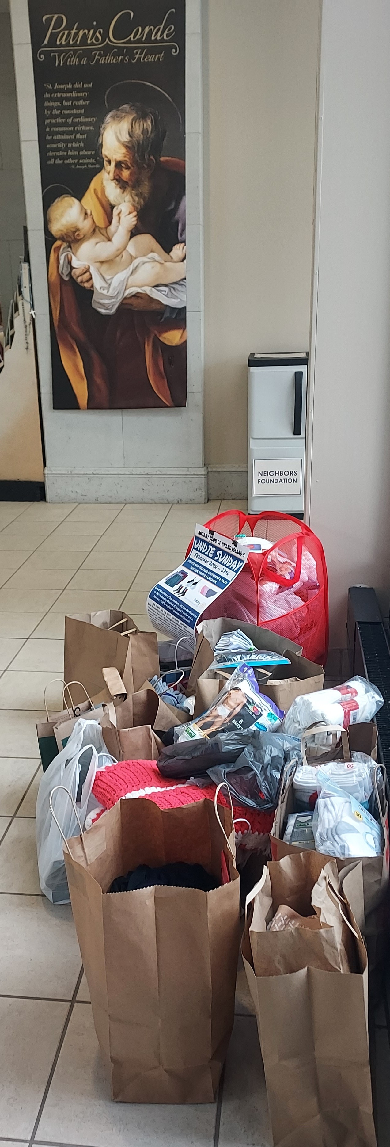 St. Stephen’s Roman Catholic Church had overflow Undie Sunday bins after Masses each of the two weekends of the promotion (Photo courtesy of Michael J. Billoni)