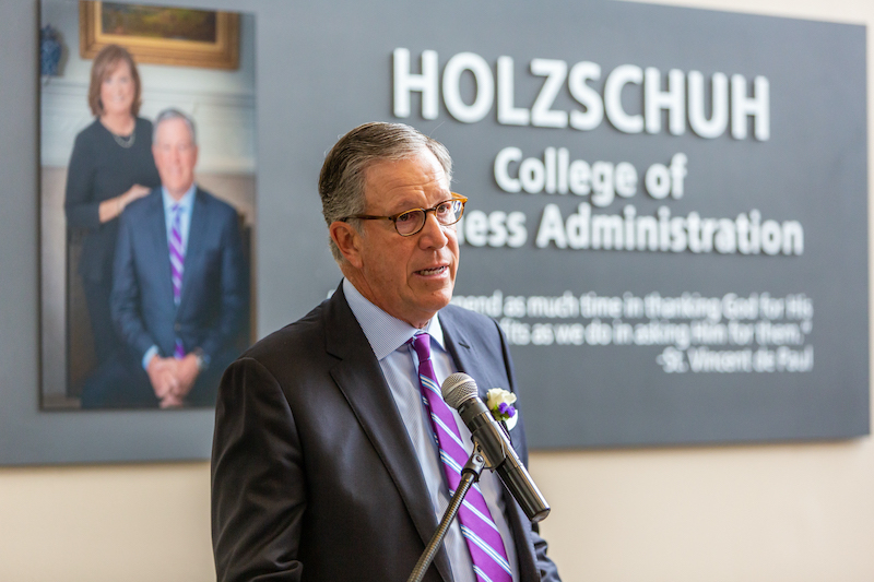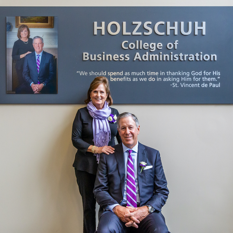 "Mary Helen and I are honored to have the family name on the College of Business. Niagara University is a special place for both of us, and we are grateful for the experience of our Vincentian education,” Jeff Holzschuh said. “We feel very fortunate to be able to share our experience and to give back to support student scholarships for business and nursing students, as well as Purple Eagle student-athletes.”