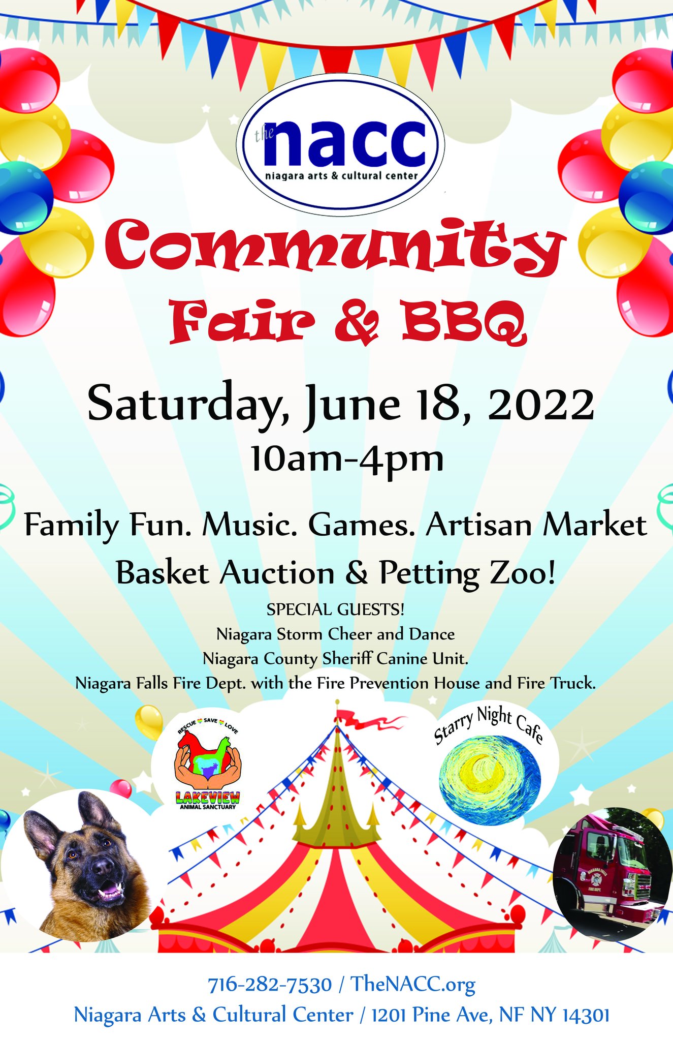 Organizers said, “Come join us for some family fun at the Niagara Arts and Cultural Center Community Fair Picnic. There will be performances by Niagara Storm Cheer and demos from the Niagara County Sheriff canine unit. Also, meet members of the Niagara Falls Fire Department, who will be visiting with the fire prevention hose and fire truck.”