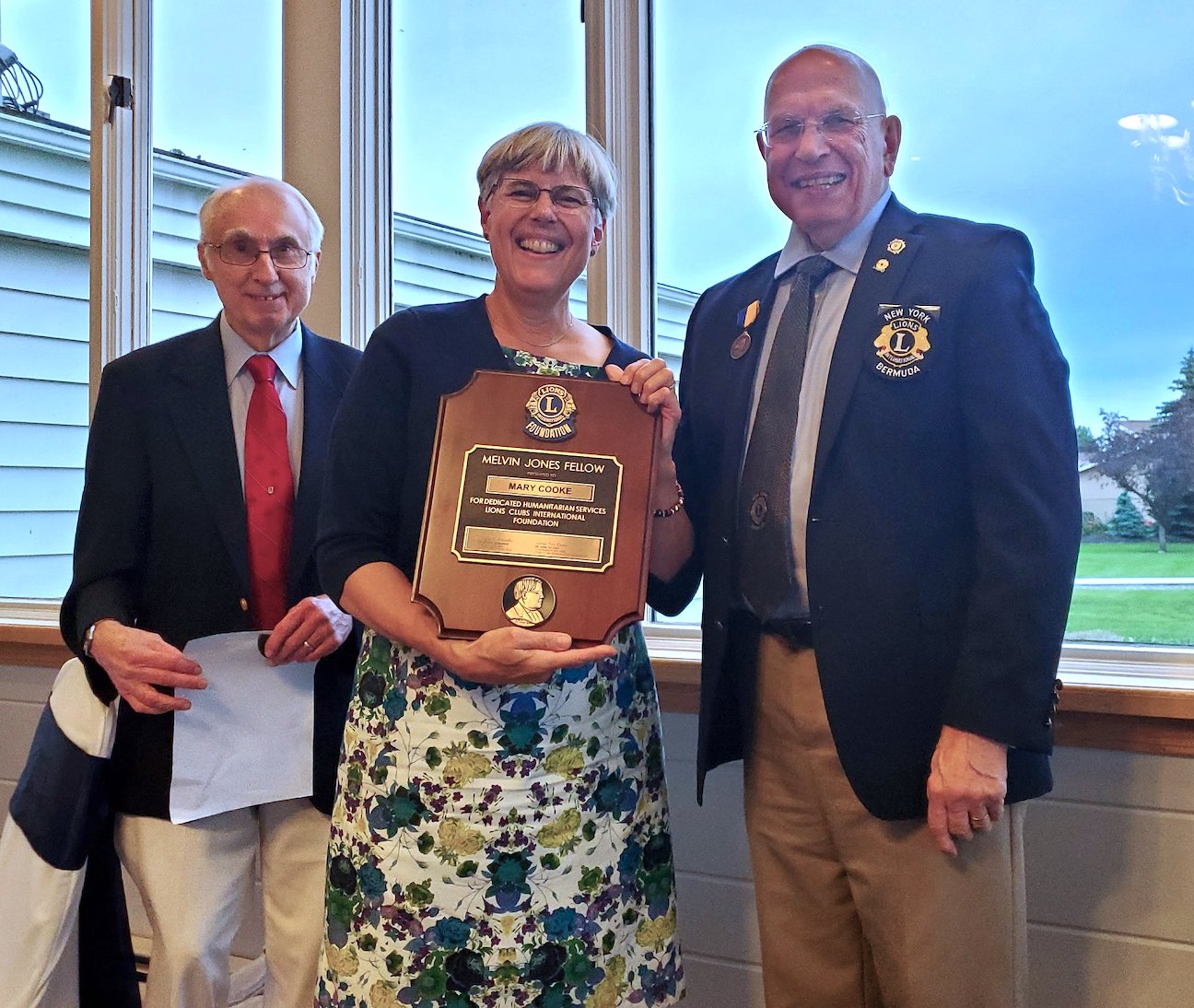 Grand Island’s Mary Cooke displays her Melvin Jones Award. Seen with her are Lion Paul Bassette (left) and Lion Tom Witkowski.
