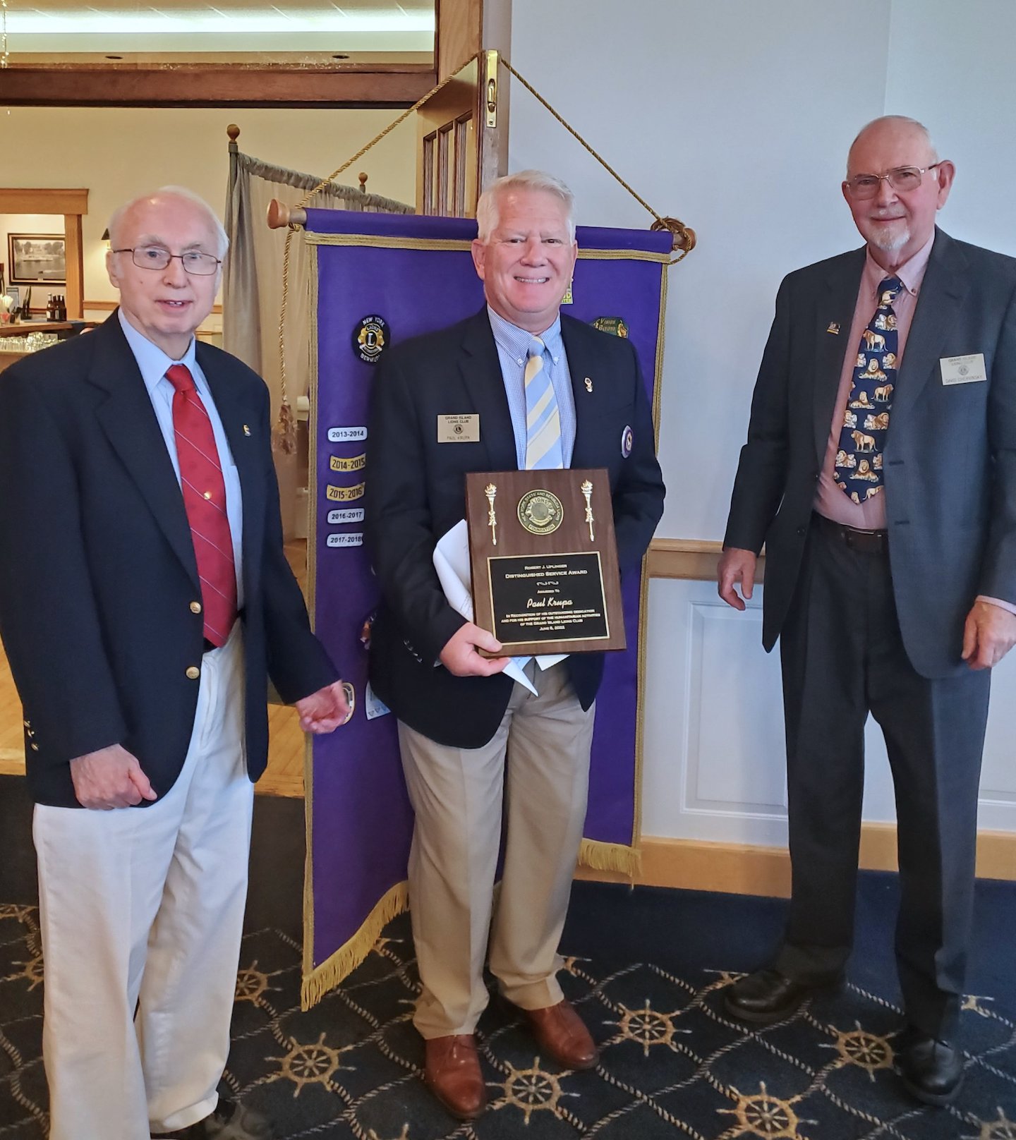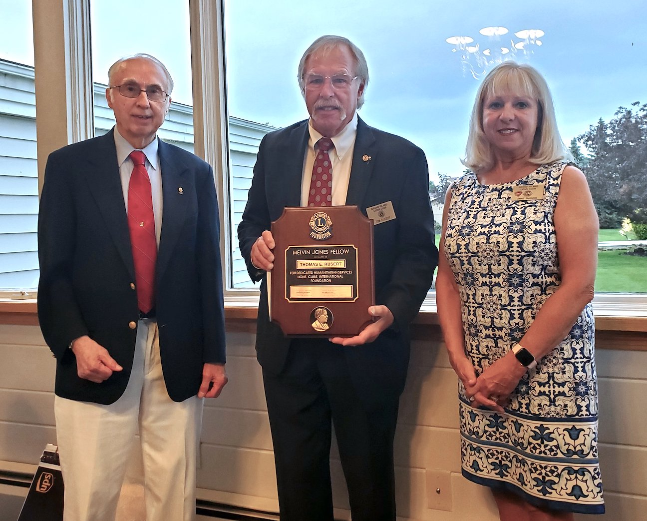Lion Tom Rusert holds his Melvin Jones Award at the Lions Club installation dinner. Past recipients with him are Lion Paul Bassette and Lion Anne Fahning.