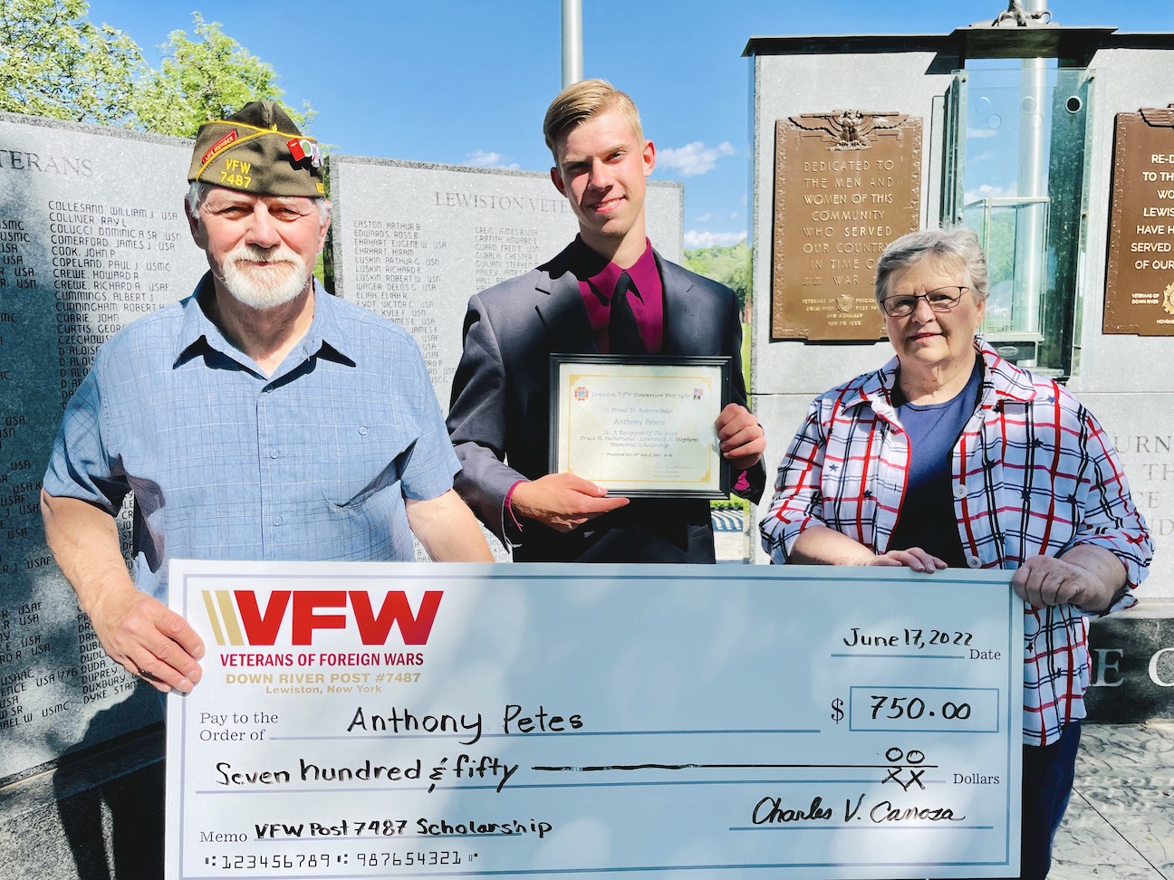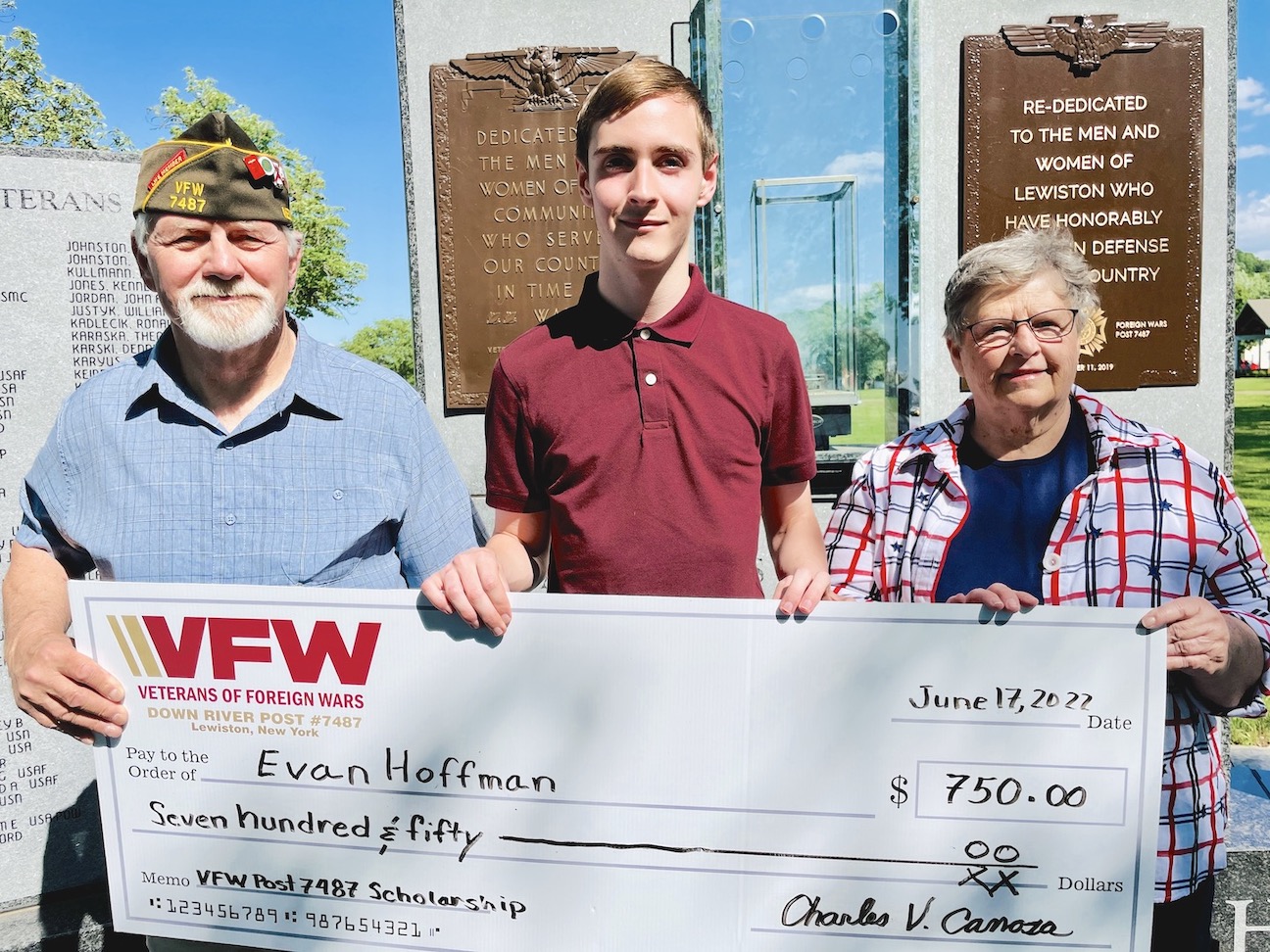 Veterans of Foreign Wars Downriver Post 7487 presented the Bruce R. Sutherland – Lawrence A. Stephens Memorial Scholarship to Evan Hoffmann and Anthony Peters at a ceremony Friday at the “Circle of Honor” in Lewiston’s Academy Park.
