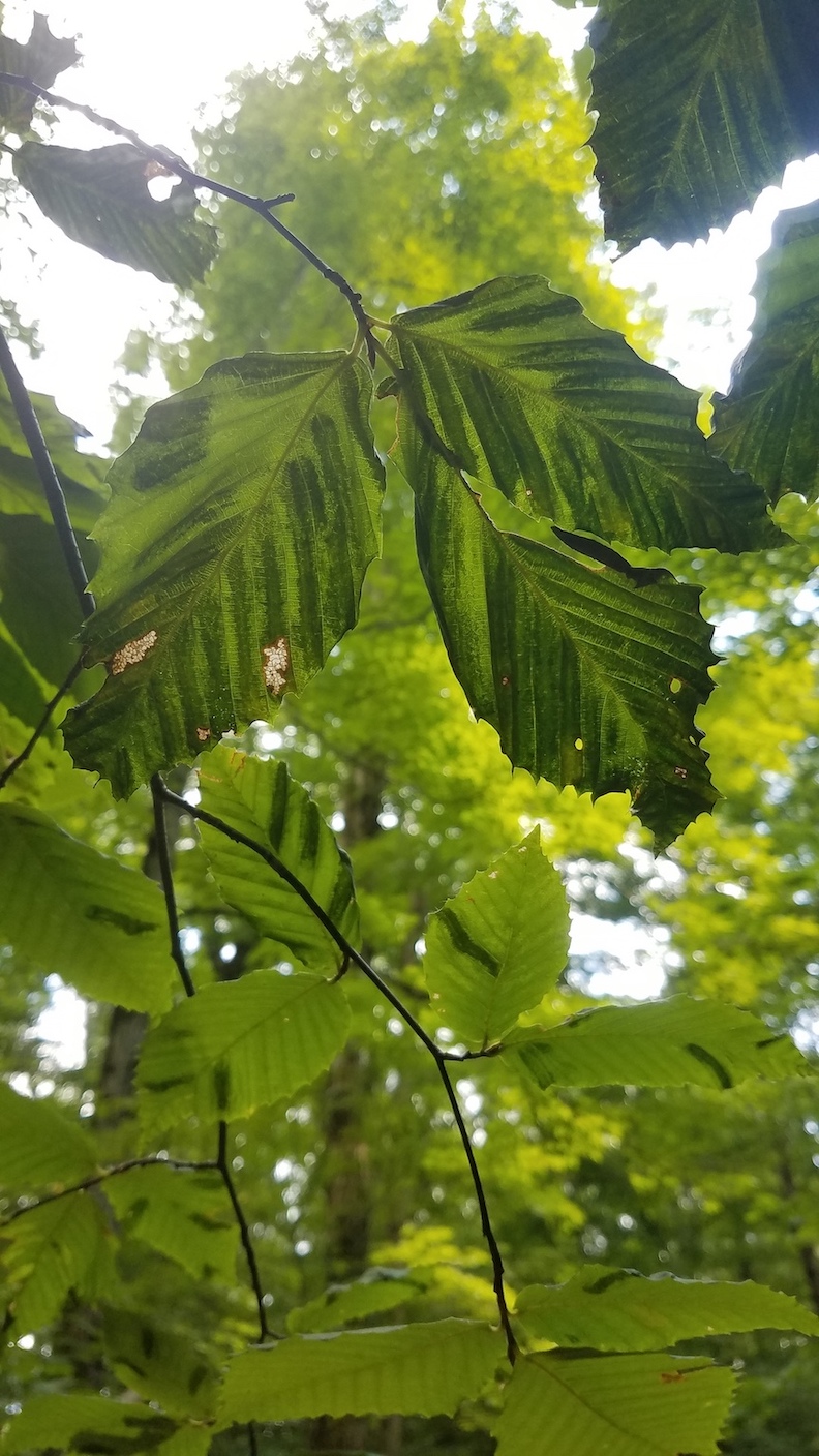 DEC stated, “The main symptom to look for on beech foliage is darkened striping between the veins, which is best seen when looking up through the canopy. Leaves with severe symptoms can be heavily banded and crinkled, with a thickened leathery texture.”