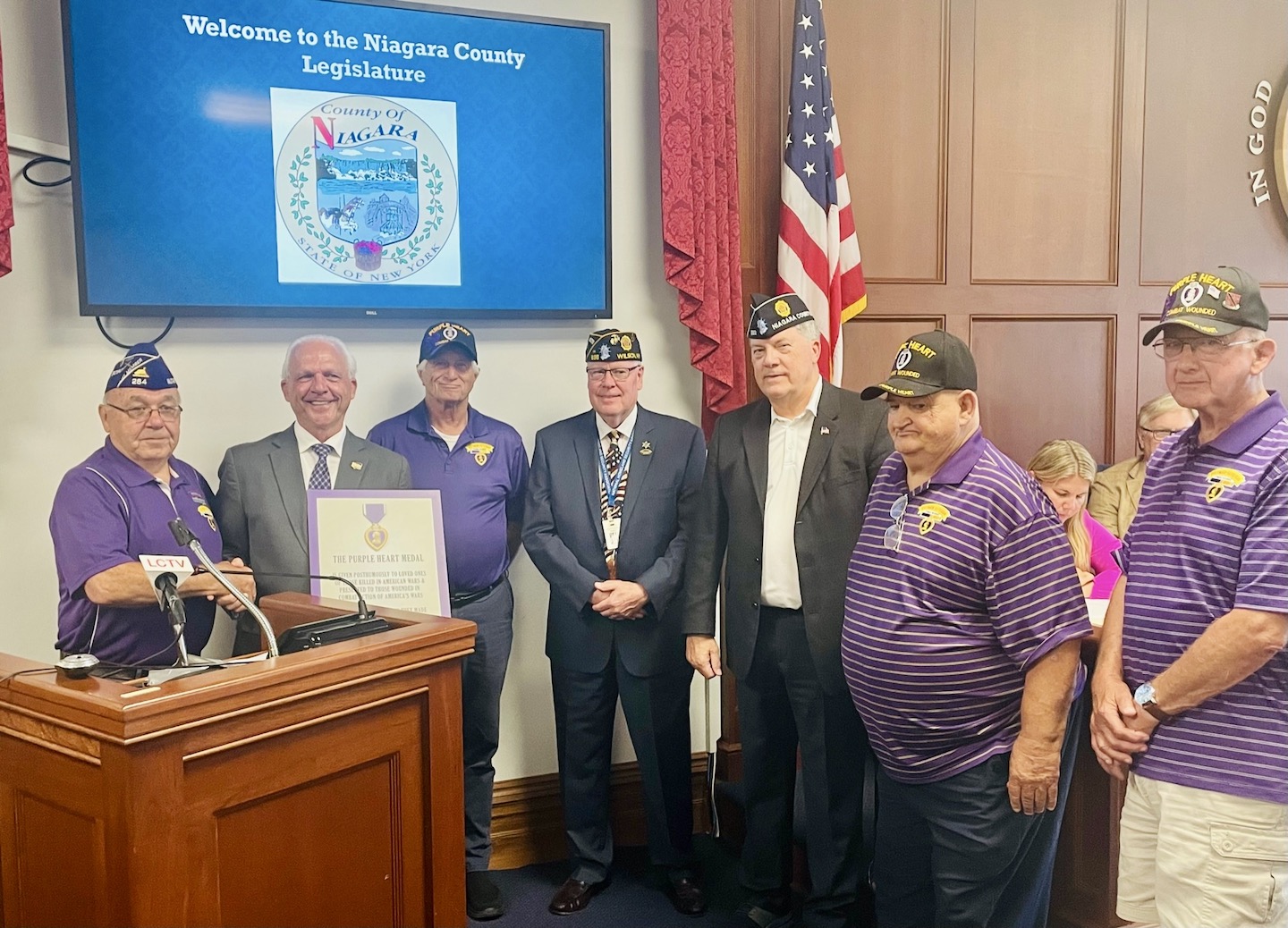 Members of the Niagara County Legislature and County Clerk Joseph A. Jastrzemski were joined by the committee, as well as members of the Purple Heart Chapter of Niagara County, to raise the Purple Heart flag outside the Niagara County Courthouse before the vote. Ron Krul, president of the chapter, presented a plaque to Jastrzemski to be displayed in the rotunda of the Niagara County Courthouse alongside the Purple Heart book.