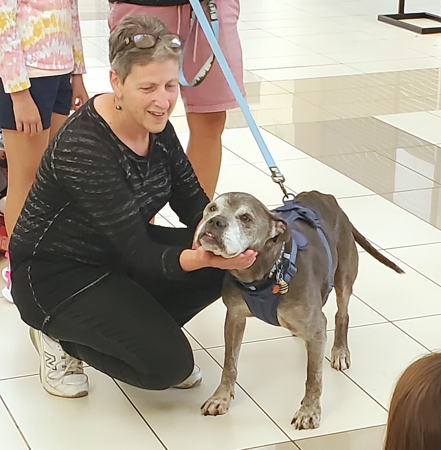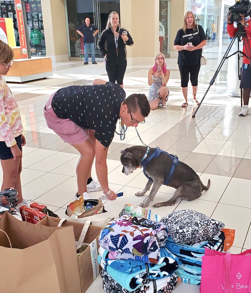 Pictured are mall guests as they took selfies and made donations of pet treats, blankets and collars for Lloyd and his friends. Lloyd is also pictured with Liz Marshall (pink shorts), director of events and marketing for the Niagara County SPCA.